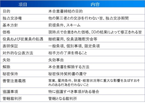 A.基本合意書とは、契約交渉段階において、買収価格やM&Aの形態などの提携基本条件が両者である程度合意に達した時点で、締結する書類のことです。基本合意書の締結は、本件実施を確約するものでは なく、最終契約に至るプロセス およびスケジュールなどの 合意内容を両当事者間で明確にする意味をもつものである点に留意が必要です。